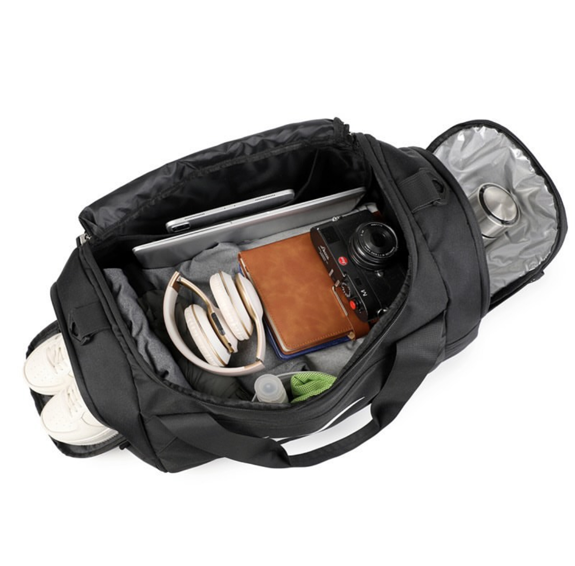 این کیف از جنس برزنتی ضدآب ساخته شده و با فضای جادار، جای مخصوص کفش و چندین جیب کاربردی، گزینهای ایدهآل برای باشگاه، سفر و استفاده روزمره است